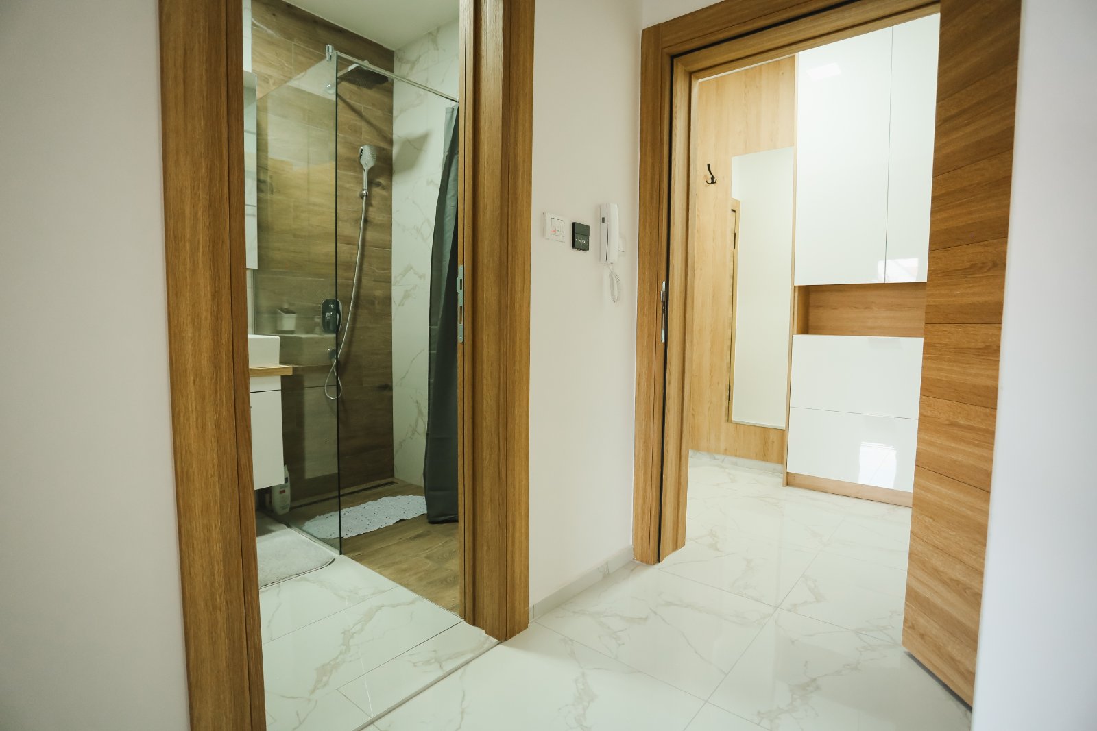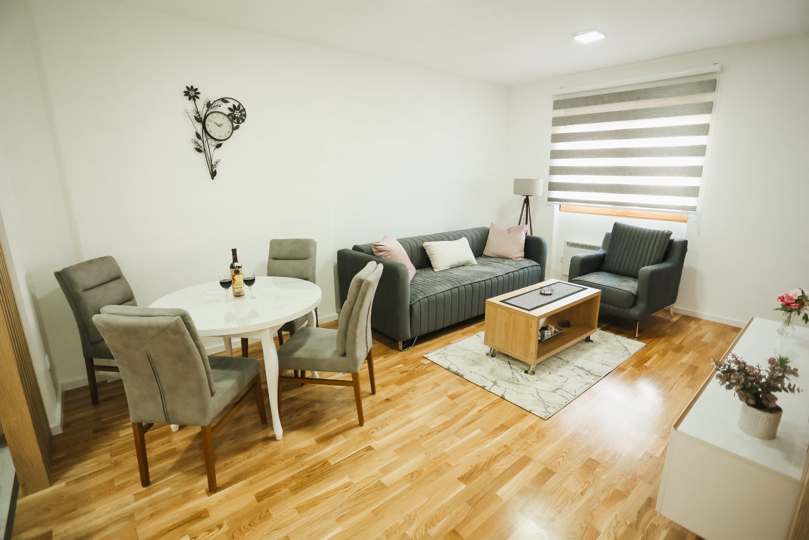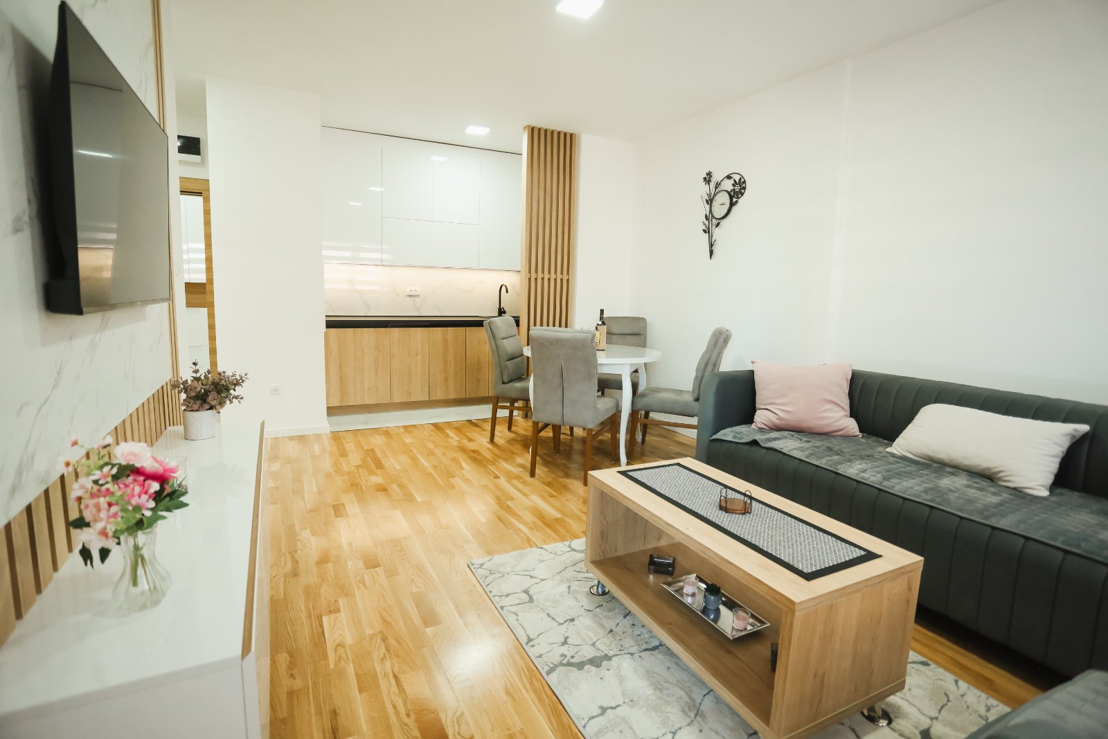 Predsoblje, kupatilo, dnevna soba spojena sa kuhinjom i trpezarijom, spavaća soba i terasa.